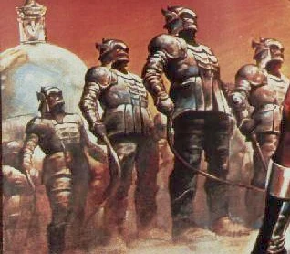 Leather Men look like soldiers in leather plated armor covering the entire body. Although it looks like someone is inside, Leather Men are without fleshy substance. When Pygar destroyed one of the Black Guards, Barbarella was shocked to find the guard broke into pieces.