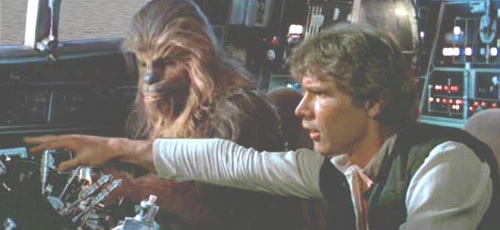 Chewie and Han in the cockpit of the Millenium Falcon.