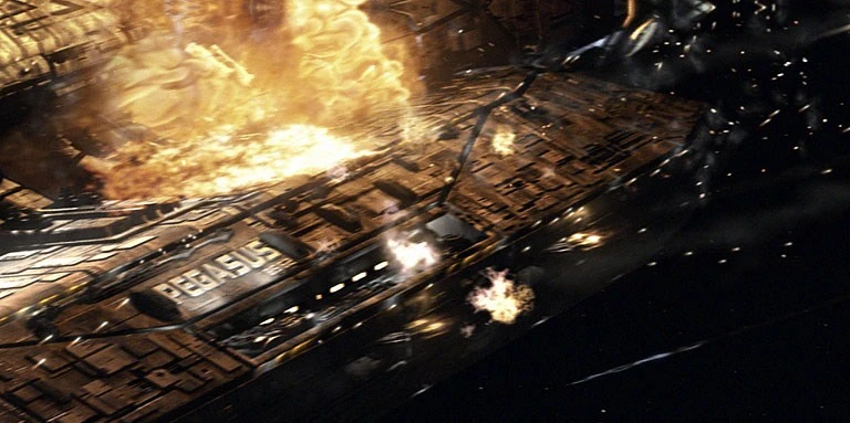 The blue beams, similar to the Master's lightning but on a much larger scale, hit the central sphere of the enemy flagship and it exploded in a jet of fiery ashes. The firefight had begun. Soon after, there was only two remaining Hauran ships, the flagship and the Exetor, the second largest ship in the fleet. This scarcity of Dreadnaughts was due to the Daleks that were individually assaulting the docking bay on each ship—the weakest point available.